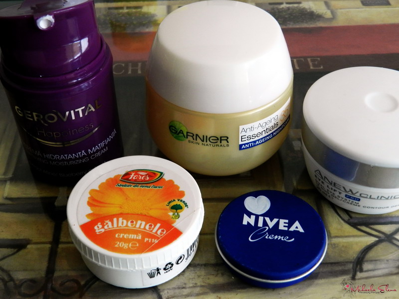 Azi vorbim putin despre produsele pe care le folosesc pentru fata. Nu imi place sa folosesc foarte multe produse pentru fata. Crema de fata imi place sa fie una matifianta, avand tenul gras ma ajuta sa mentin sub control excesul de sebum. De curand am inceput sa folosesc si crema de fata antirid pentru seara, am ales una de la Garnier si desi o folosesc doar de cateva saptamani pot sa spun ca imi place. Seara inainte de culcare imi place sa folosesc in jurul ochilor crema de la Nivea varianta albastra pe care toata lumea o stie. Imi hidrateaza foarte bine zona ochilor si dimineata pielea este mai hidratata si cearcanele nu mai sunt atat de evidente . In zilele in care imi simt foarte uscate buzele seara inainte de culcare folosesc crema de galbenele si a doua zi buzele arata mult mai bine si se simt mai hidratate.